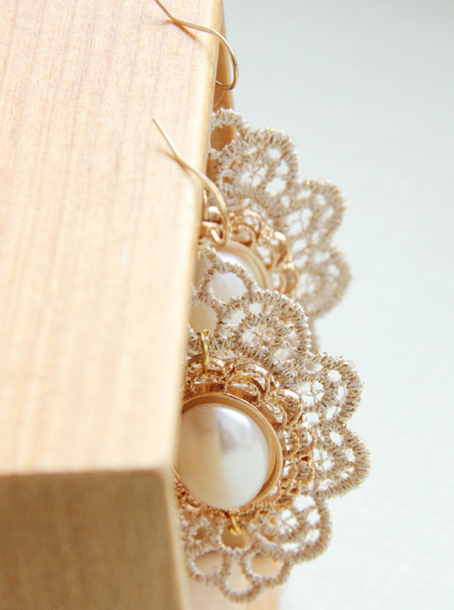 Materials: Alloy ear hook, Golden silk lace, Artificial pearls, Gold alloy fittings