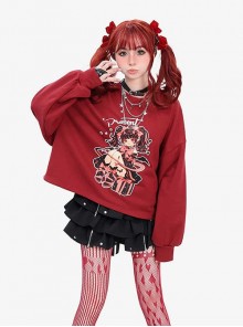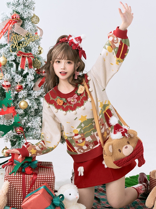 Bear Gift Series Cute Chunky Christmas Sweet Print Red White Splicing Knitted Crew Neck Kawaii Fashion Pullover Sweater