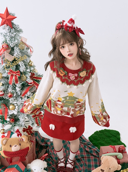 A very cute Christmas-style printed pullover sweater. The main color is red, white, and green. It is printed with patterns of small brown bears, Christmas trees, and gifts. There is a circle of small white fur balls around the neckline.