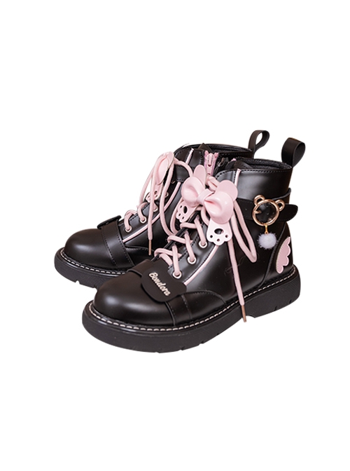 Cute college-style Martin boots, short round toe, flat low heel, side zipper design, cat claw strap bow, bear cartoon metal buckle, white wings, and small fur ball decoration.