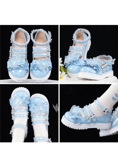 Big Round Head Solid Color Mesh Heart Shape Pleated Lace Sweet Bandage Lolita Platform Shoes