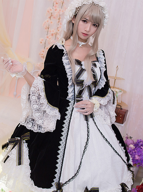 Flower Bowknots Black And White Stitching Sweet Lolita Trumpet Sleeve Dress