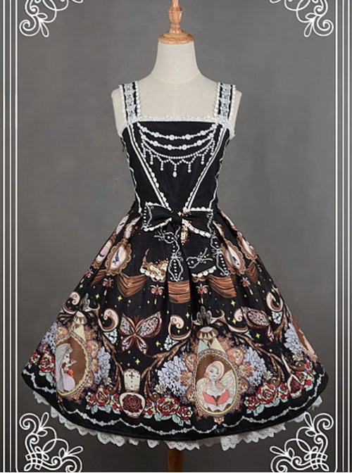 Black Bead Chain Printed Lace Hemline Lolita Dress