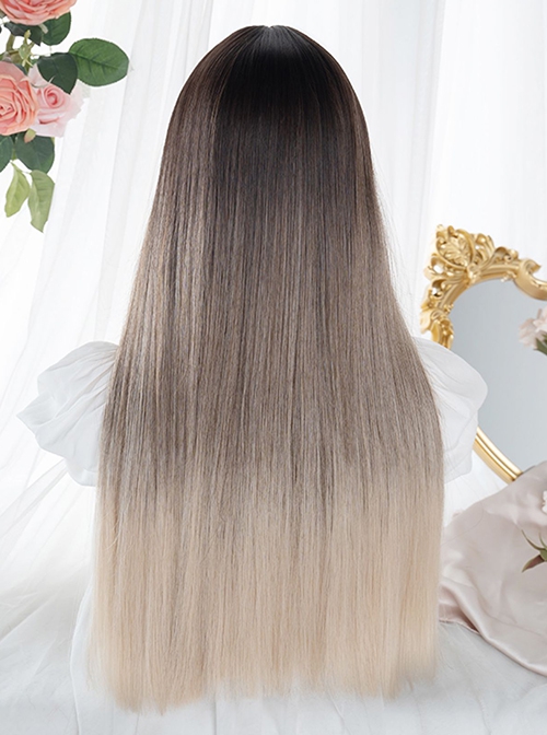 Black Brown Gradient Milk Tea Gold Air Bangs Natural Long Straight Hair Classic Lolita Wig