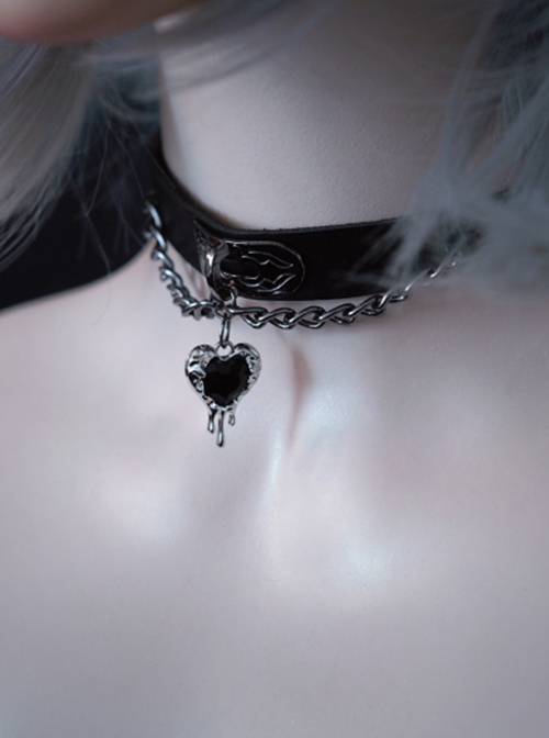 A cool and sweet punk gothic-style necklace made of faux leather with a heart-shaped pendant and chain.