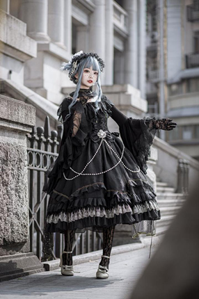 This class of Lolita fashion includes black-colored skirts that consist of a large volume frilly Lolita dress approaching the knees. Made up of Polyester fiber, these Lolita skirts seem perfect for tea parties. The sleeves are pretty long to reach the wrists. Furthermore, it's embellished with laces on the borders and sleeves. It can be worn during summer and spring.