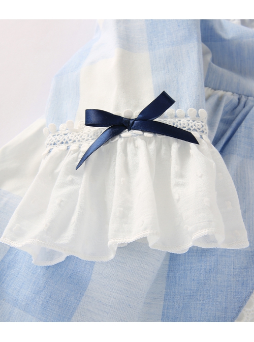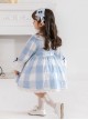 Blue And White Plaid Design Cute Pleated Ruffle Trim Bow Knots Classic Lolita Long Sleeve Kid Dress