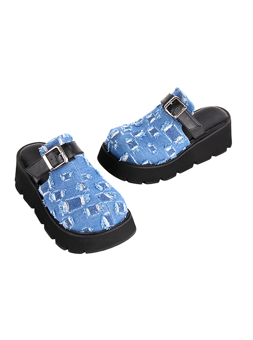 Blue Beggar Denim Stitching Big Round Head Design Square Buckle Belt Trim Punk Platform Shoes
