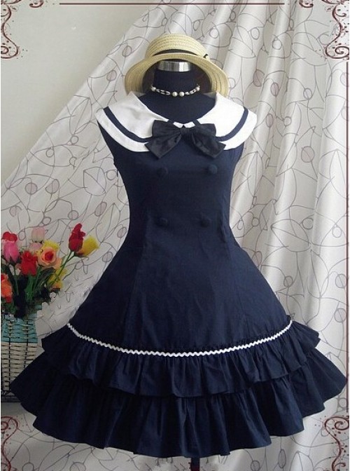 Blue Sleeveless Bow Preppy Style Cotton Lolita Dress