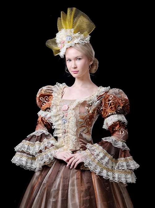 A retro and dignified coffee-colored royal aristocratic performance dress with classic puff sleeves, multi-layered lace decoration, and gorgeous Victorian-style patterns on the hem.