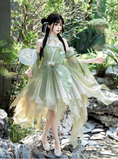The Butterfly Memories Spring Mountain Series presents a Sweet Lolita dress that captures the essence of Chinese elegance. This light green dress features a delicate butterfly pattern, adorned with pearls on the suspender straps, perfect for a graceful and charming look.