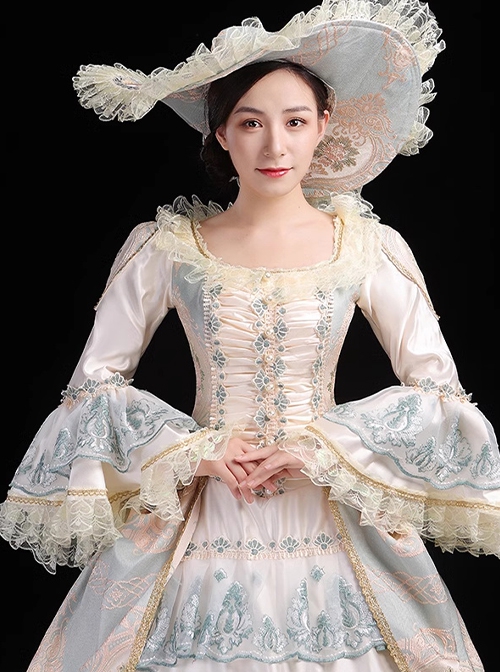 European palace style classical aristocratic dress, champagne satin spliced ​​with light blue lace decoration, the colors are elegant and harmonious, and the style design is gorgeous and rich.
