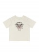Loose mid-length apricot short-sleeved t-shirt, subculture bat wing love print, shoulder hollowing, neckline metal love decoration.