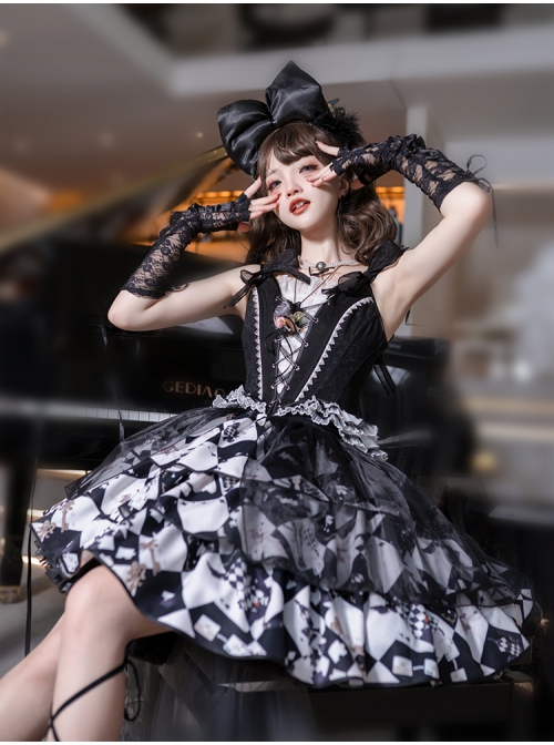 Checkerboard Game Series Lace Lace-Up Corset Checkerboard Print Split Type Black Gothic Lolita Sleeveless Corset Skirt Set