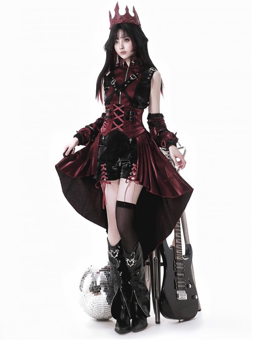 This Chief Assassin Series punk Lolita set features a metallic black and red color scheme with a gothic retro vibe. It includes a lace-up suspender skirt, vest, shorts, and arm sleeves for a complete edgy look.