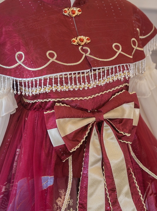 Chinoiserie Vintage Gorgeous Print Bow Lace Fringe Fake Collar Detachable Design Classic Lolita Sleeveless Dress