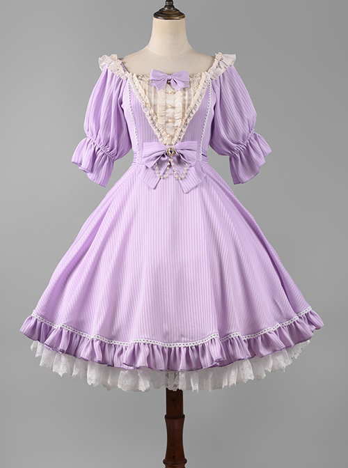 Classic Lolita Solid Color Vertical Pattern Design Pleated Ruffle Neckline Bow Knot Decoration Short Sleeve Dress