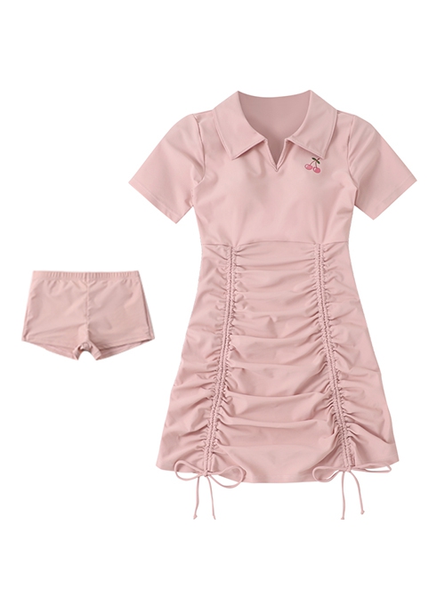 College Style Cute Age-Reducing Solid Color Lapel Drawstring Short-Sleeved Split Swimsuit