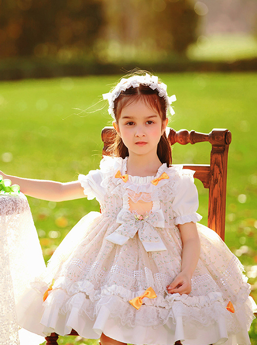 Cute Small Pink Flowers Pleated Lace Bow Knots Decoration Children Classic Lolita Kids Short Sleeve Dress
