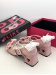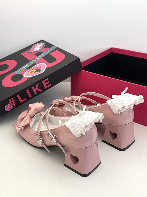 Heart-shaped cutout at heel, satin bow, round toe, high heel, double straps.