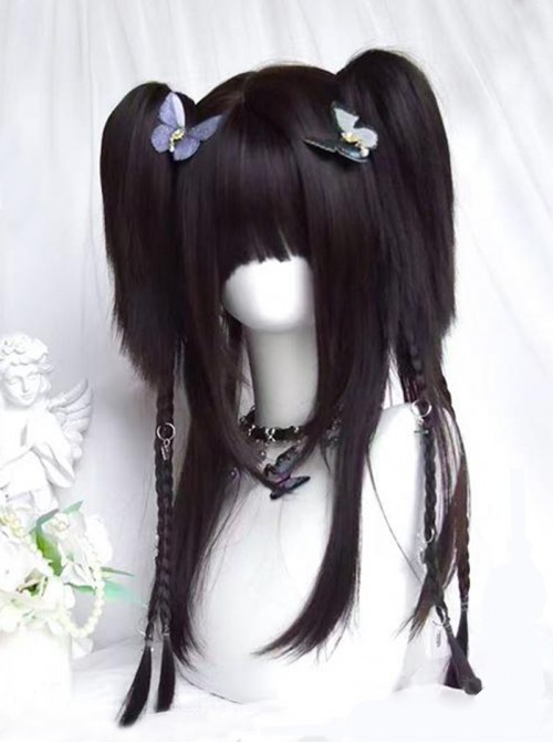 Dancing DNA Series Punk Lolita Retro Y2K Black Waterfall Sweet Cool Twin Braids Wig