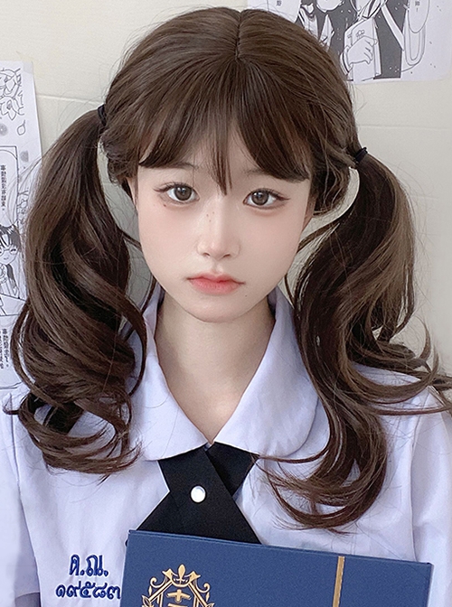 Dark Brown Natural Curly Hair Qi Bangs Lolita Medium Length Lolita Wigs