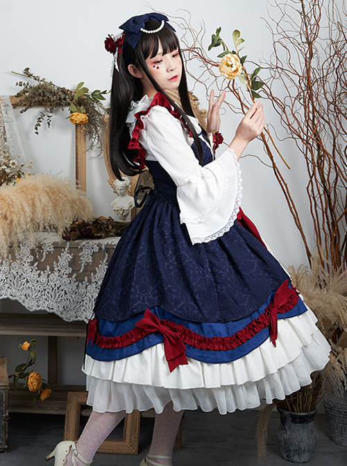 Delicate Print Ornament Pleated Lace Red Bow Knot Design Cross Tie Jacquard Lace Classic Lolita Dress