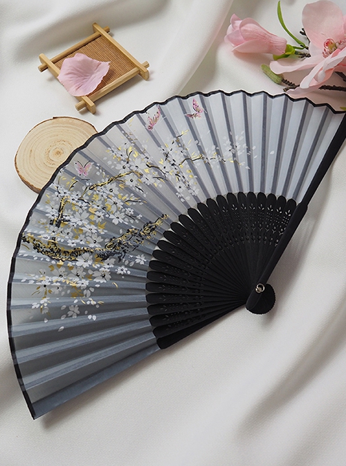 elegant Exquisite Traditional Japanese style versatile Sakura butterfly print Black fan bone Kawaii Fashion Folding Fan