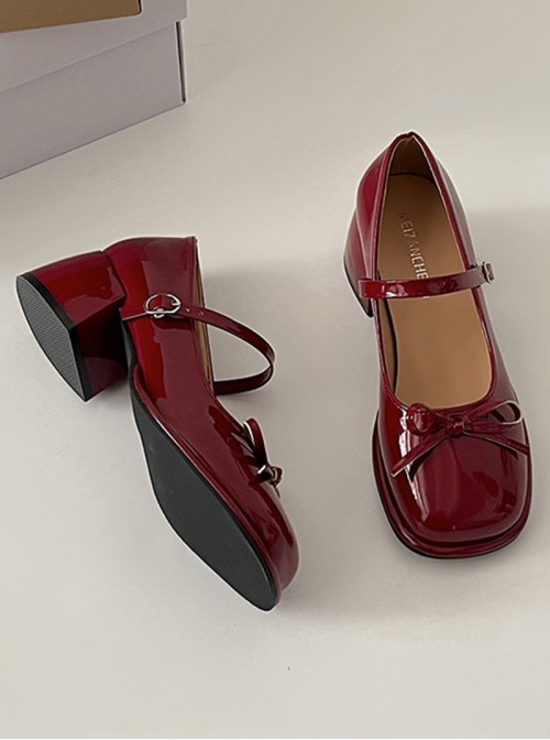 Elegant French Style Classic Lolita Delicate Bowknot Tie Square Toe Mid Heel Mary Jane Patent Leather Shoes