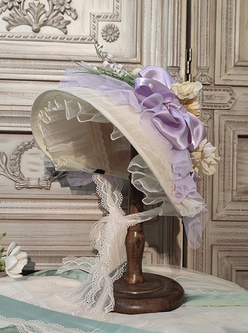 Elegant Pleated Lace Mesh Design Three-Dimensional Flower Bow Knots Decoration Jacquard Lace Straps Classic Lolita Bonnet