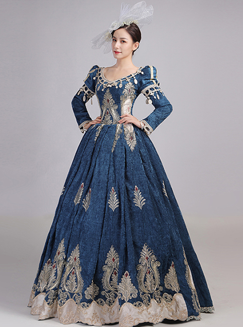 Lake Blue Long Dark Golden Embroidery Classical European Court Style Lolita Prom Long Sleeve Dress