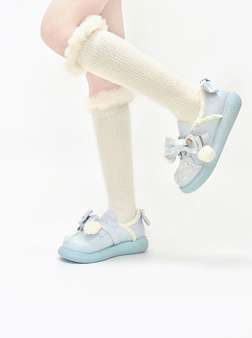 Fat Star Series Winter Plus Velvet Warm Sweet Lolita Cute Fur Ball Polka Dots Bowknot Leather Shoes