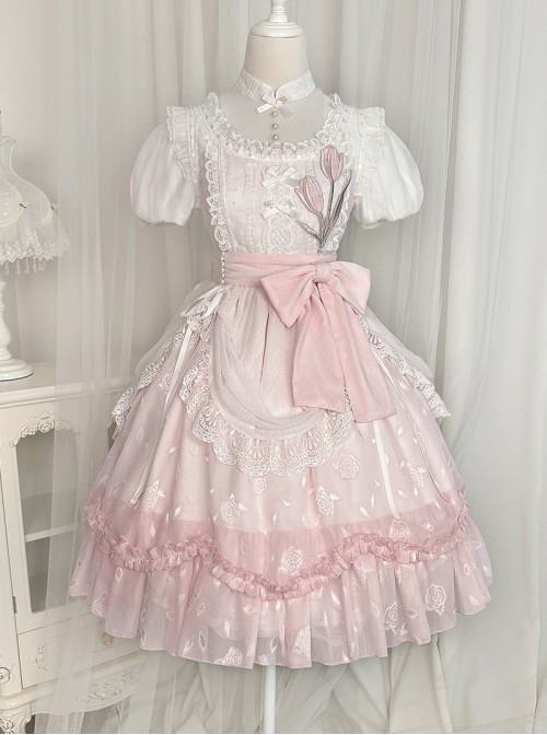 This Sweet Lolita dress from the Flowers and Poetry series features a pink tulip design, elegant lace, ruffled edges, and bubble sleeves, perfect for a charming and romantic look.