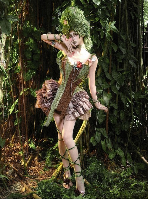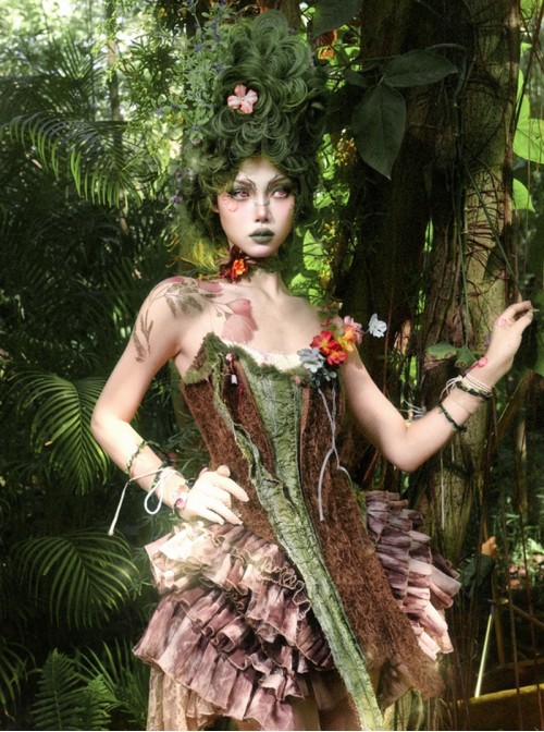 Unique faux bark and branch design, perfect for a natural elf look. The boned and lace-up details cinch the waist, while the plush material adds a soft touch for spring.