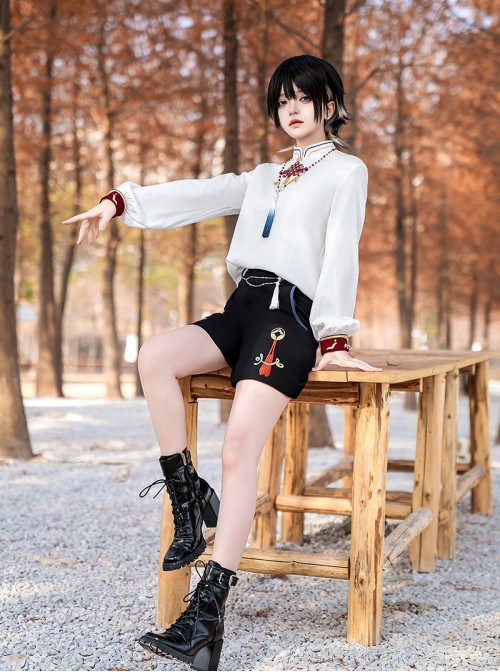 These stylish black shorts blend Chinese elements with Ouji fashion, featuring decorative coins and tassels for a unique and cultural look.