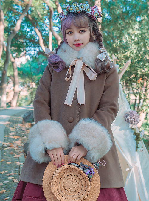 Gentle Pure Color Embroidery Classic Lolita Fur Collar Woolen Coat