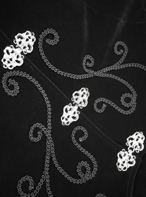 Black weft velvety fabric splicing three-dimensional jacquard fabric, made of fake two pieces design.Hand-embroidered chest, decorated with vintage hook clasp.