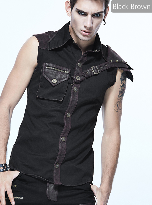 Gothic Rock Lapel Slim Black Or Brown Metal Decoration Men's Sleeveless Shirt