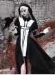 Gothic Style Black White Stand Collar PU Patent Leather Stitching Crucifix Design Short Front Long Back Hem Halloween Long-Sleeved Dress