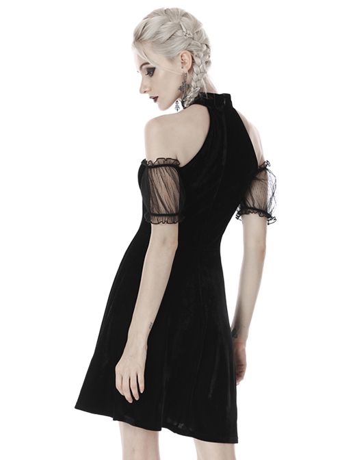 Gothic Style Elegant Velvet Metal Moon Shaped Pendant Black Halter Neck Strap Sleeves Dress