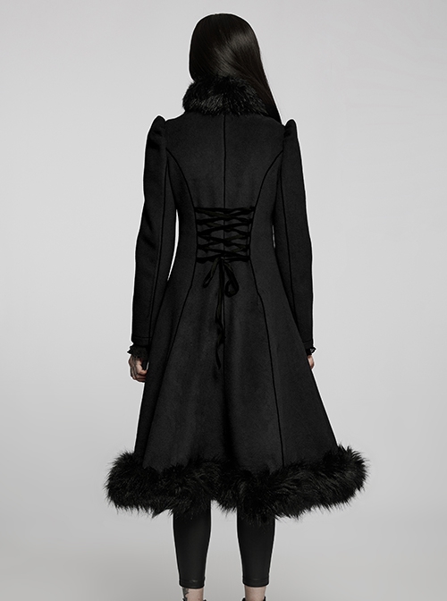 Gothic Style Exquisite Embroidered Appliques Collar And Lower Plush Decoration Black Long Sleeves Slim Wool Coat