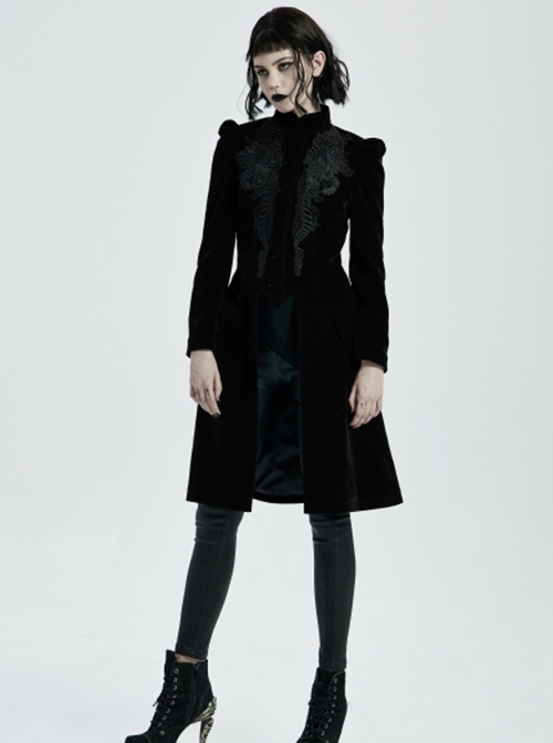 Gothic Style Exquisite Embroidery Applique Premium Velvet Vintage Palace Black Long Sleeves Slim Coat