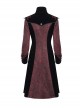 Black jacquard fabric stitched with wine red weft velveteen, leather strips at the stitching, delicate wine red gothic patterns embroidered on the shoulders and cuffs, carved mushroom buttons on the cuffs, and carved metal crosses on the collar tab.