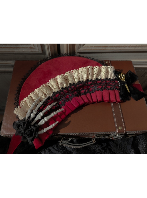 Gothic Style Halloween Skull Jacquard Pleated Lace Bow Metal Decoration Lolita Bonnet