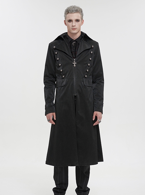Gothic Style Handsome Double Breasted Front Center Metal Cross Zipper Pendant Black Long Lapel Coat