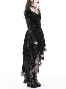 Gothic Style Elastic Printed Knitted Irregular Hem Low Cut Hollow Lace Black Long Sleeved Lace Dress
