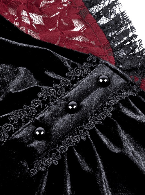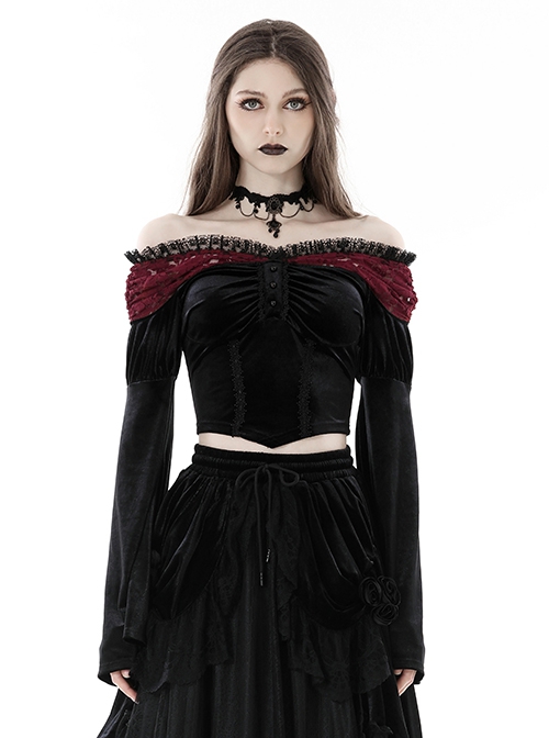 Gothic Style Luxury Velvet Exquisite Red Lace Cross Straps Elegant One Shoulder Black Trumpet Sleeves Top