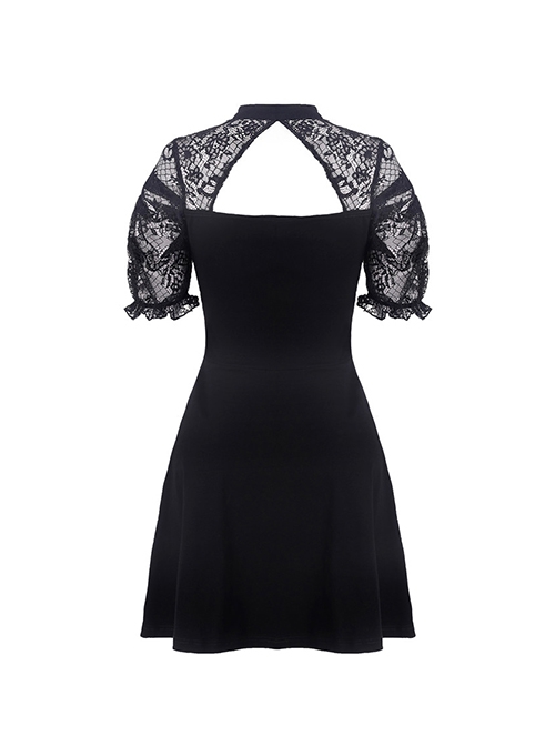 Gothic Style Retro Elegant Lace Mesh Sleeves Chest Straps Backless Black Halter Neck Short Dress