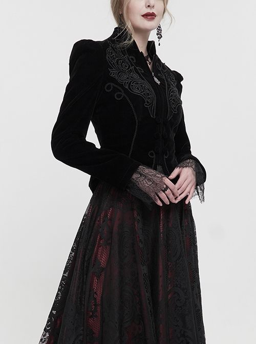 Gothic Style Soft Velvet Fabric Exquisite Applique On The Front Center Stand Collar With Metal Zipper Pendant Black Warm Long Sleeve Jacket