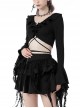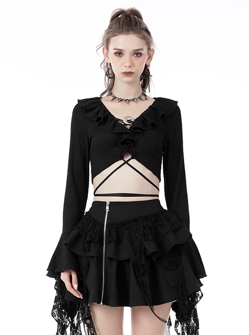 Gothic Style Witch Ruffle Metal Star Moon Decorated Lapel Lace Ripped Trumpet Sleeves Black Sexy Short Top